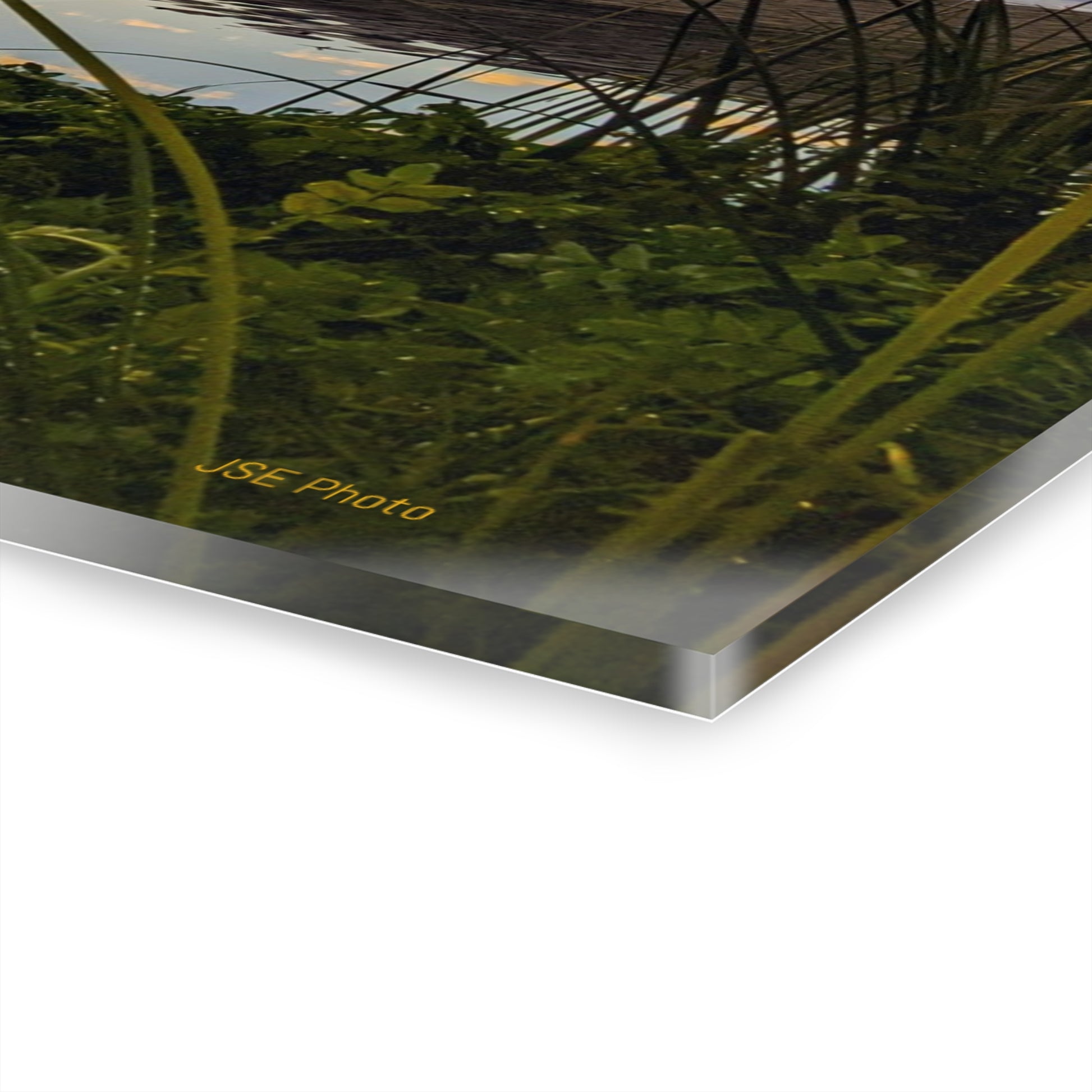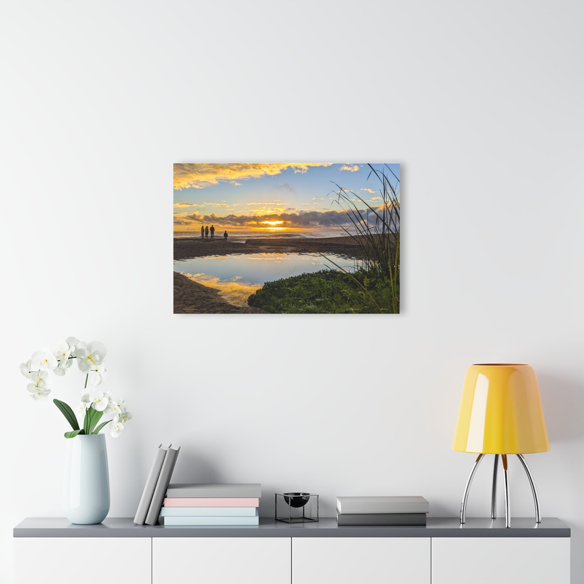 Golden light spills across tide pools as the day exhales with silhouettes watching. This acrylic print turns that quiet coastline moment into a luminous, museum-quality panel that hangs like a window on your wall. The image’s reflections and soft silhouettes feel alive against the crystal-clear acrylic, and the white vinyl backing deepens color and contrast.