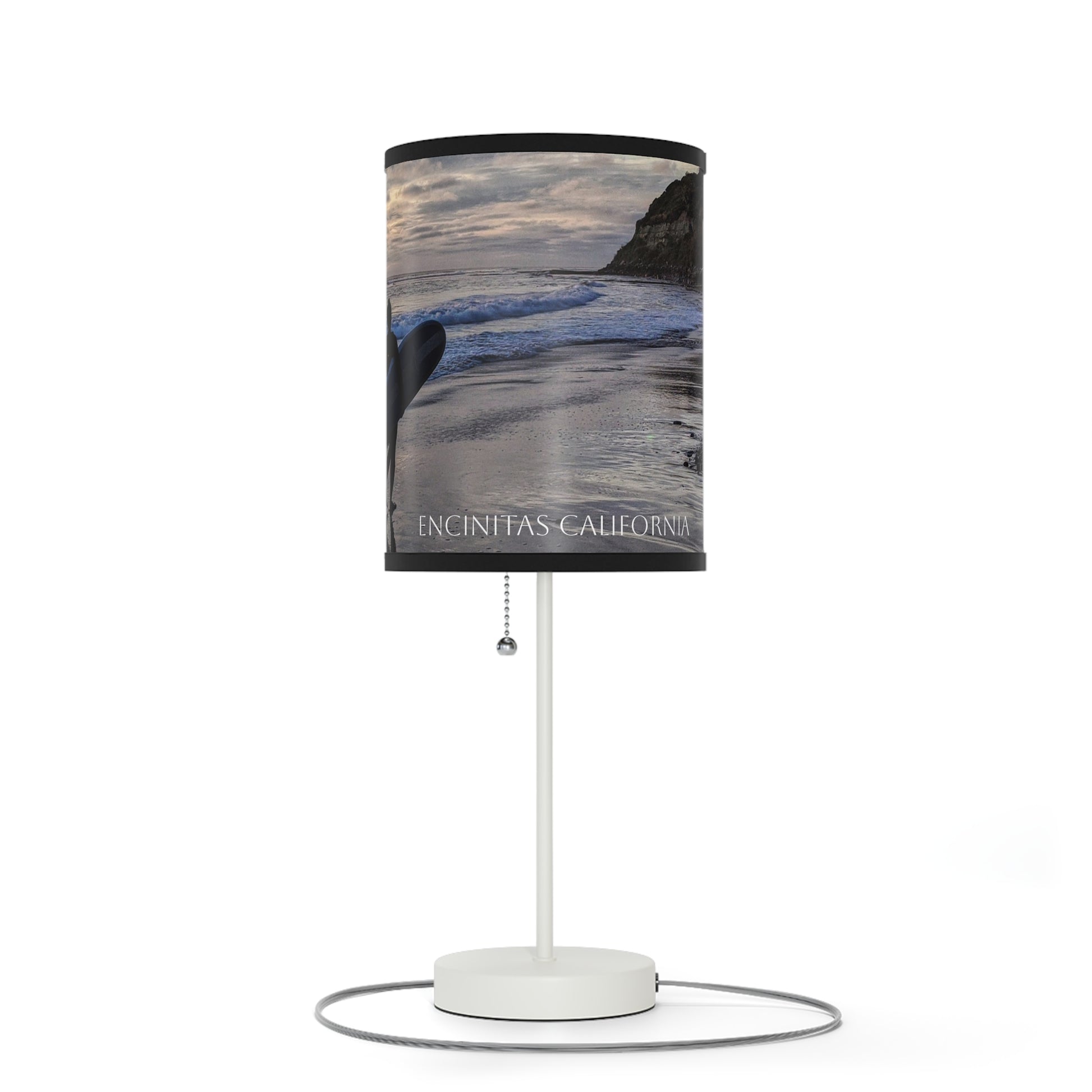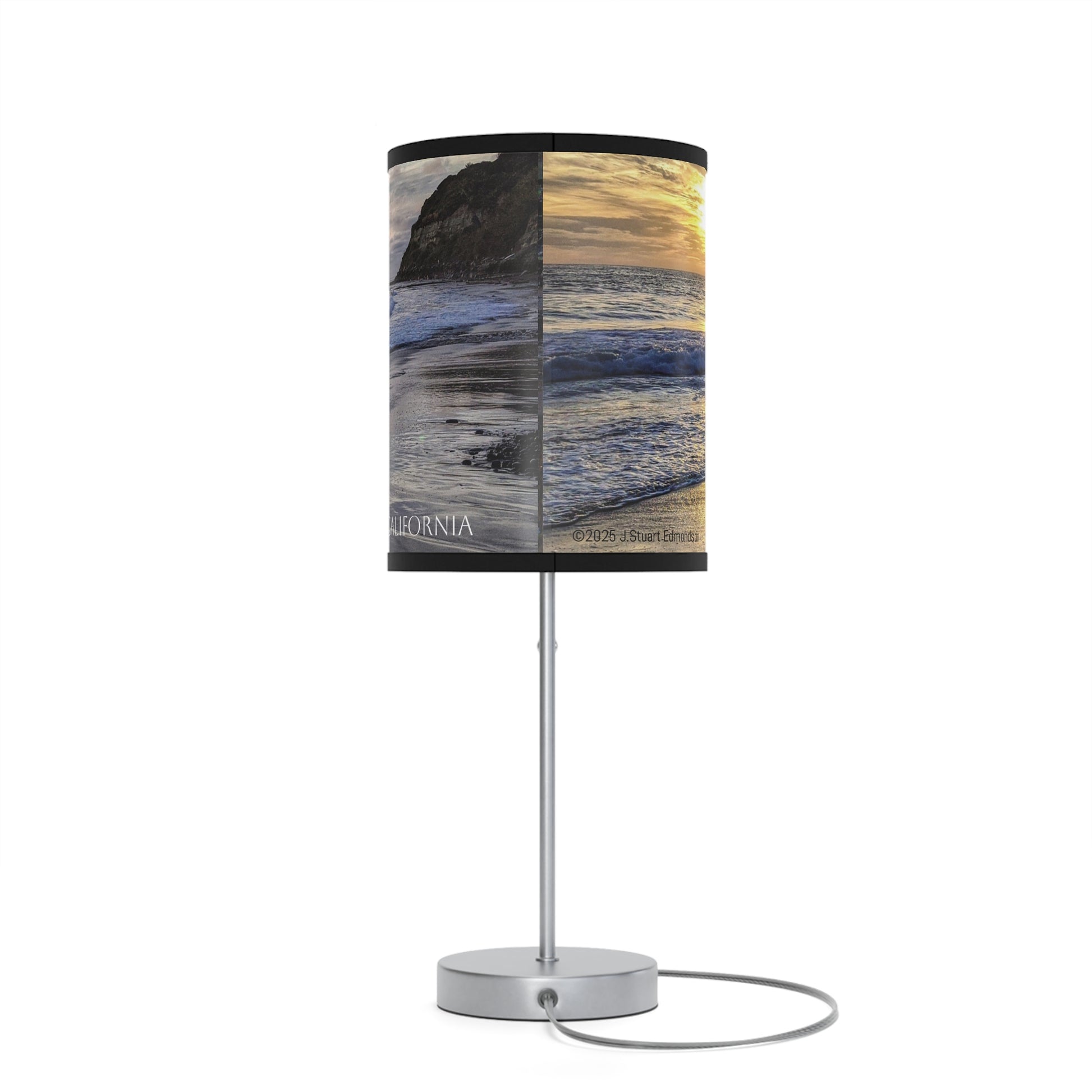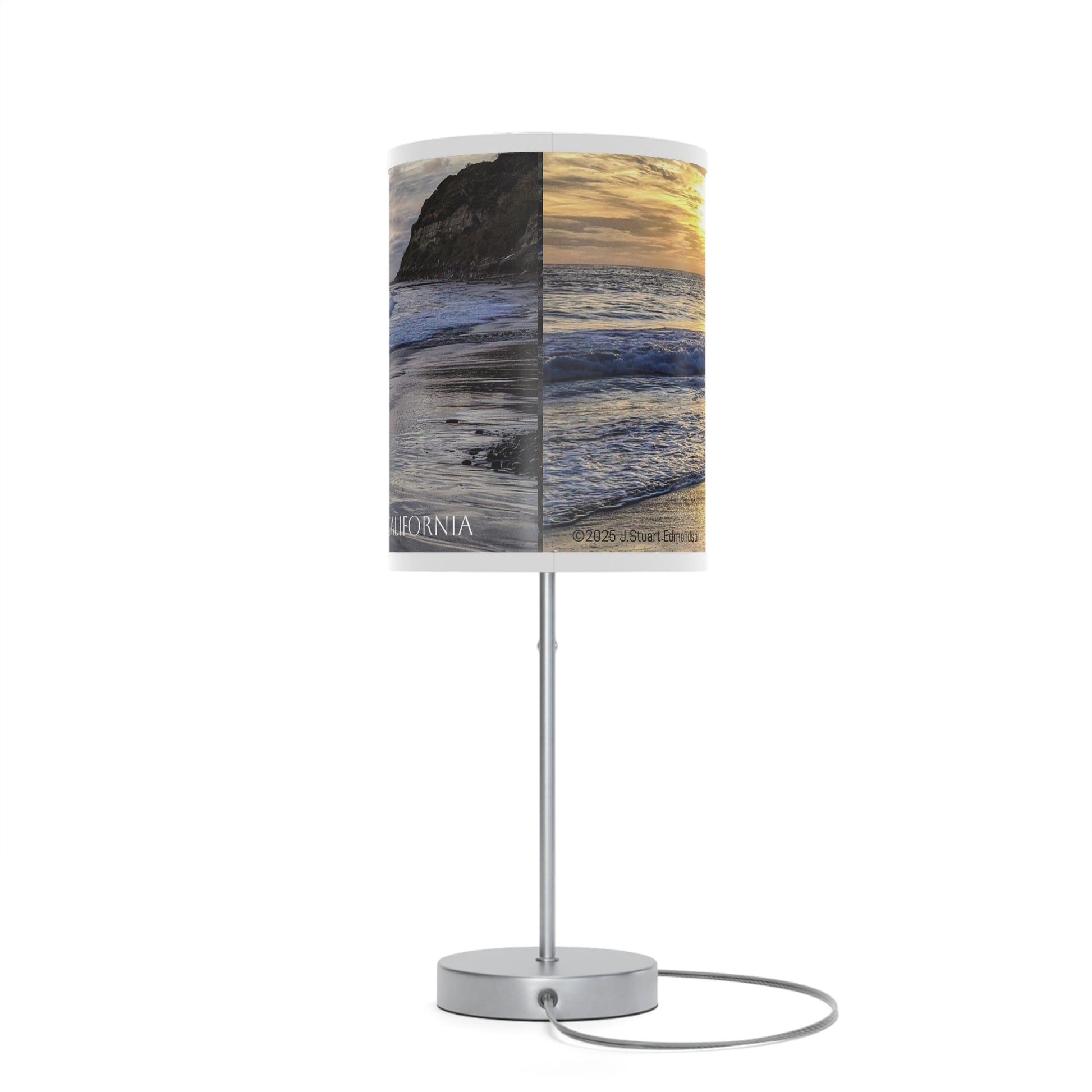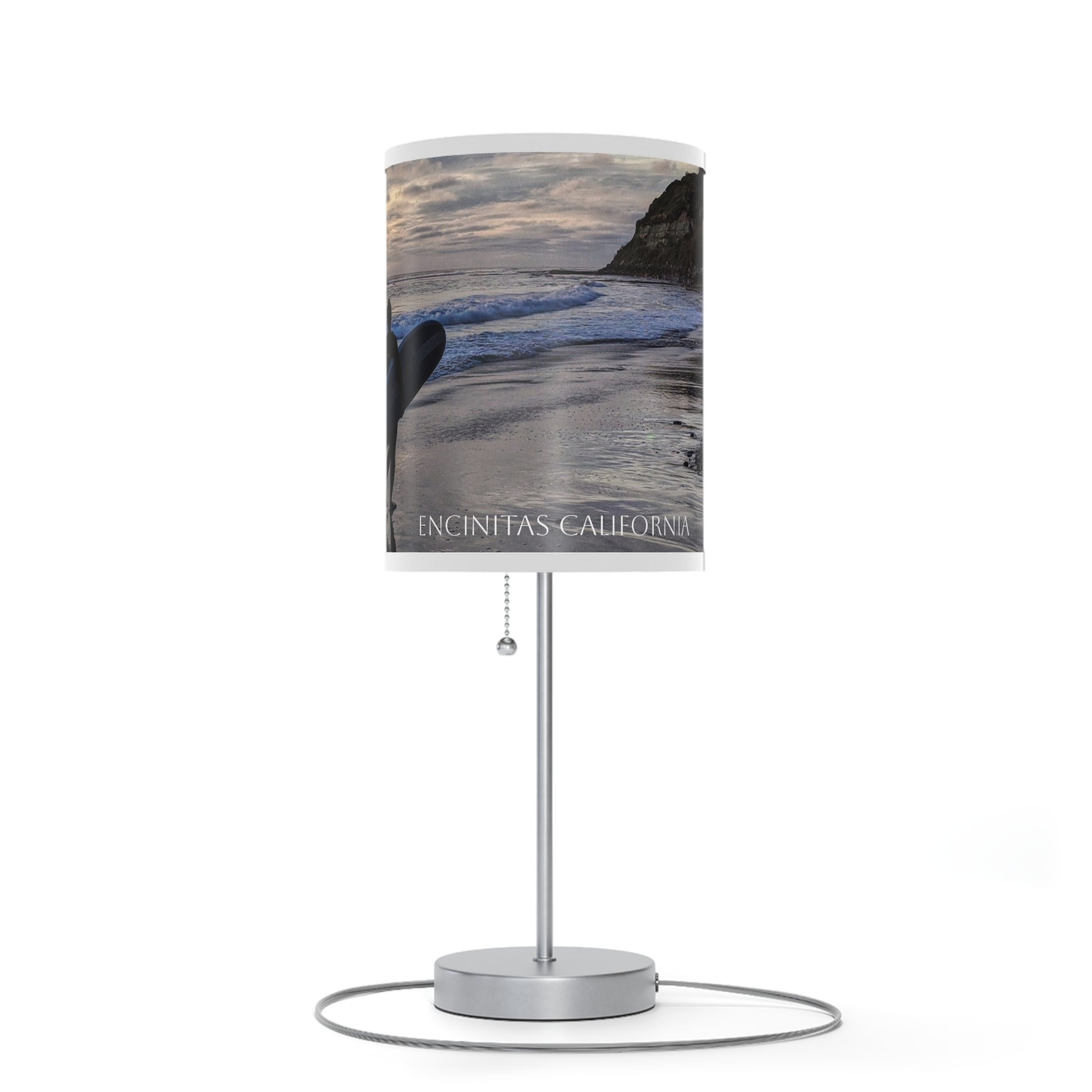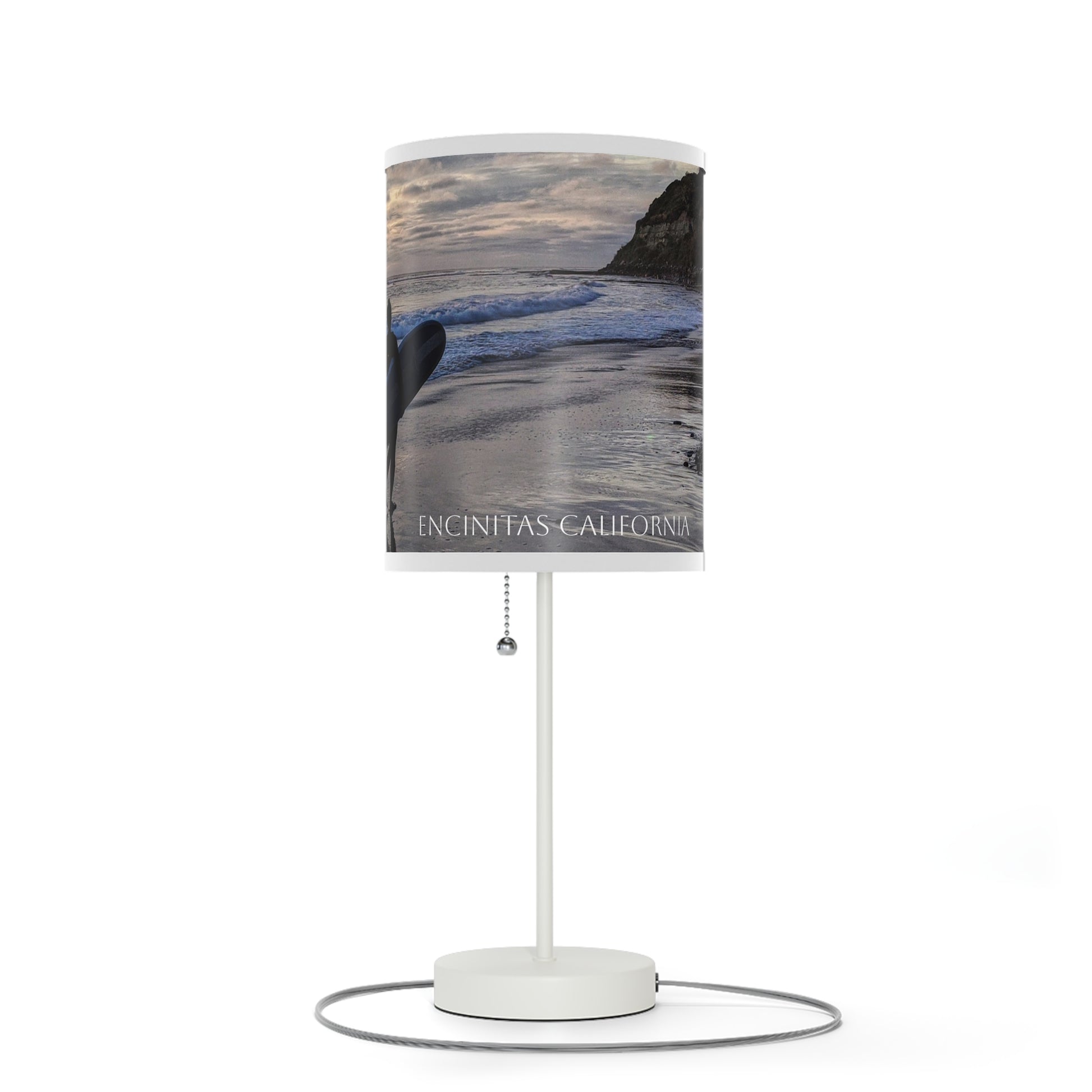 Illuminate your space with the warm and cozy lighting of this Swamis Vibe House Lamp featuring a high-res printed shade inspired by the 'Swamis Vibe' of a secluded surfing beach in California.