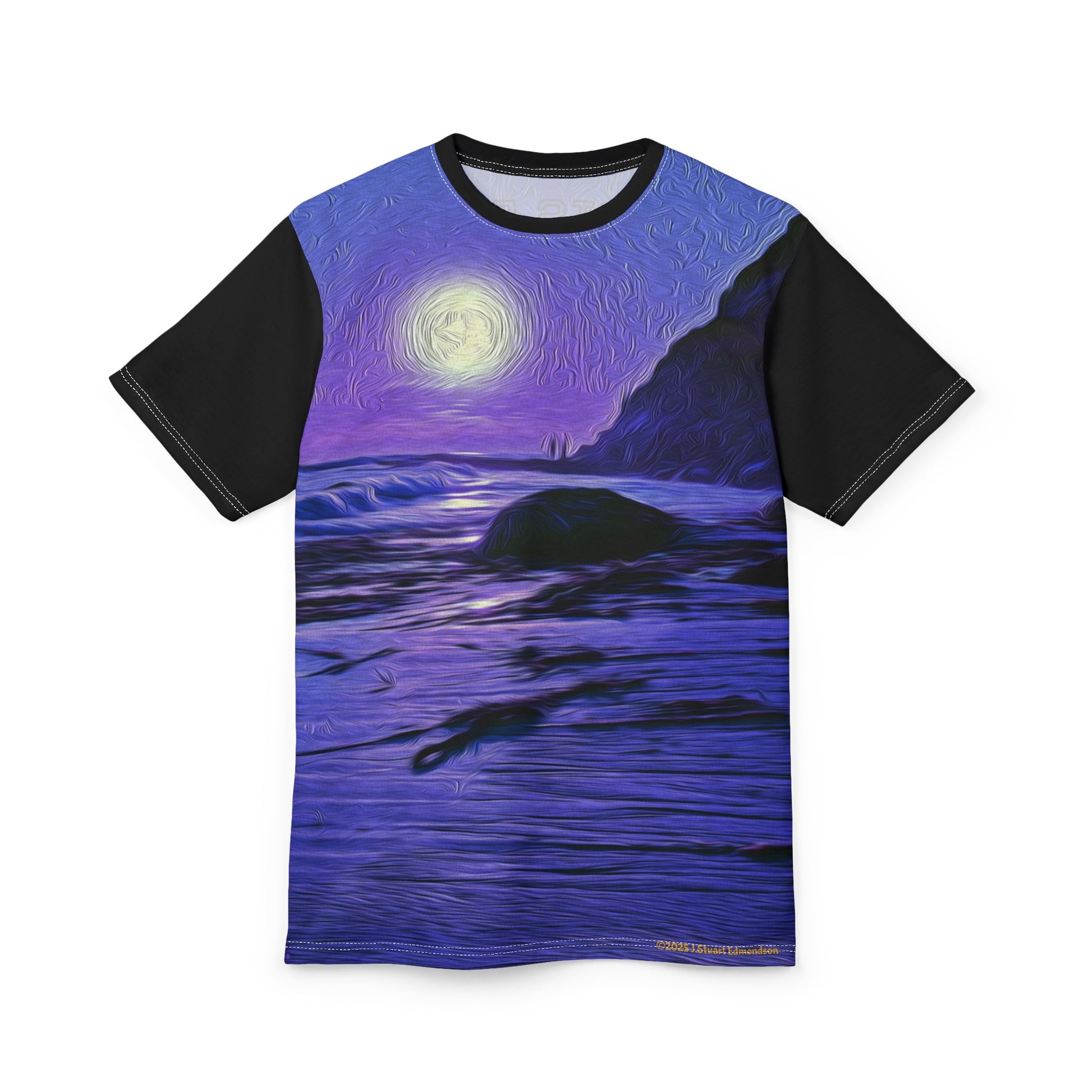 This custom T designed by photographer JSE features a dark purple moonlit night at Swami's Surf Park with a captivating design inspired by serene ocean views under a moonlit sky. This shirt delivers a sense of tranquility and wonder.