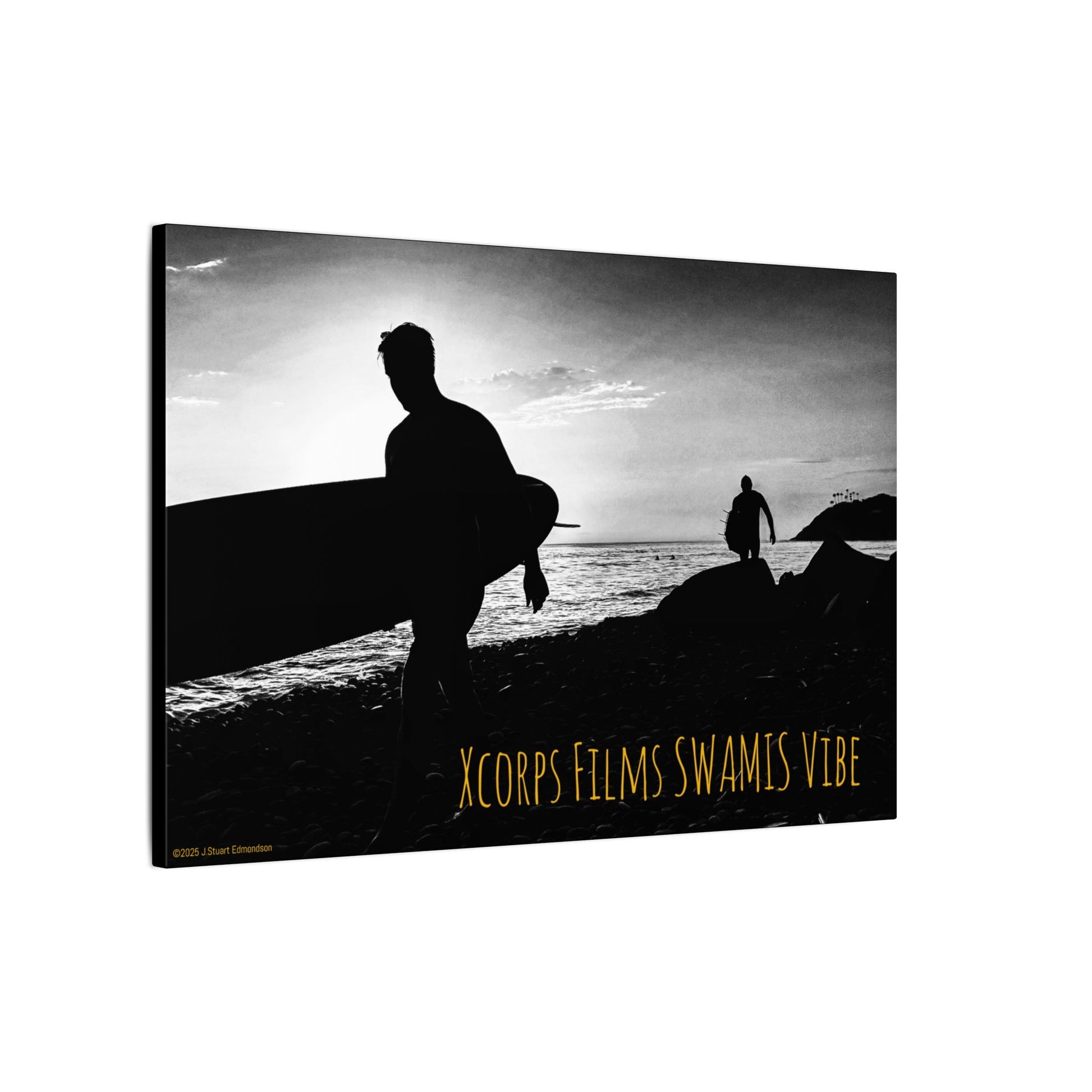 Experience the harmonious 'Swamis Vibe' with this rad BW JSE canvas print featuring 2 surfers with their boards on the beach at Swamis Surf Park in Encinitas southern California.