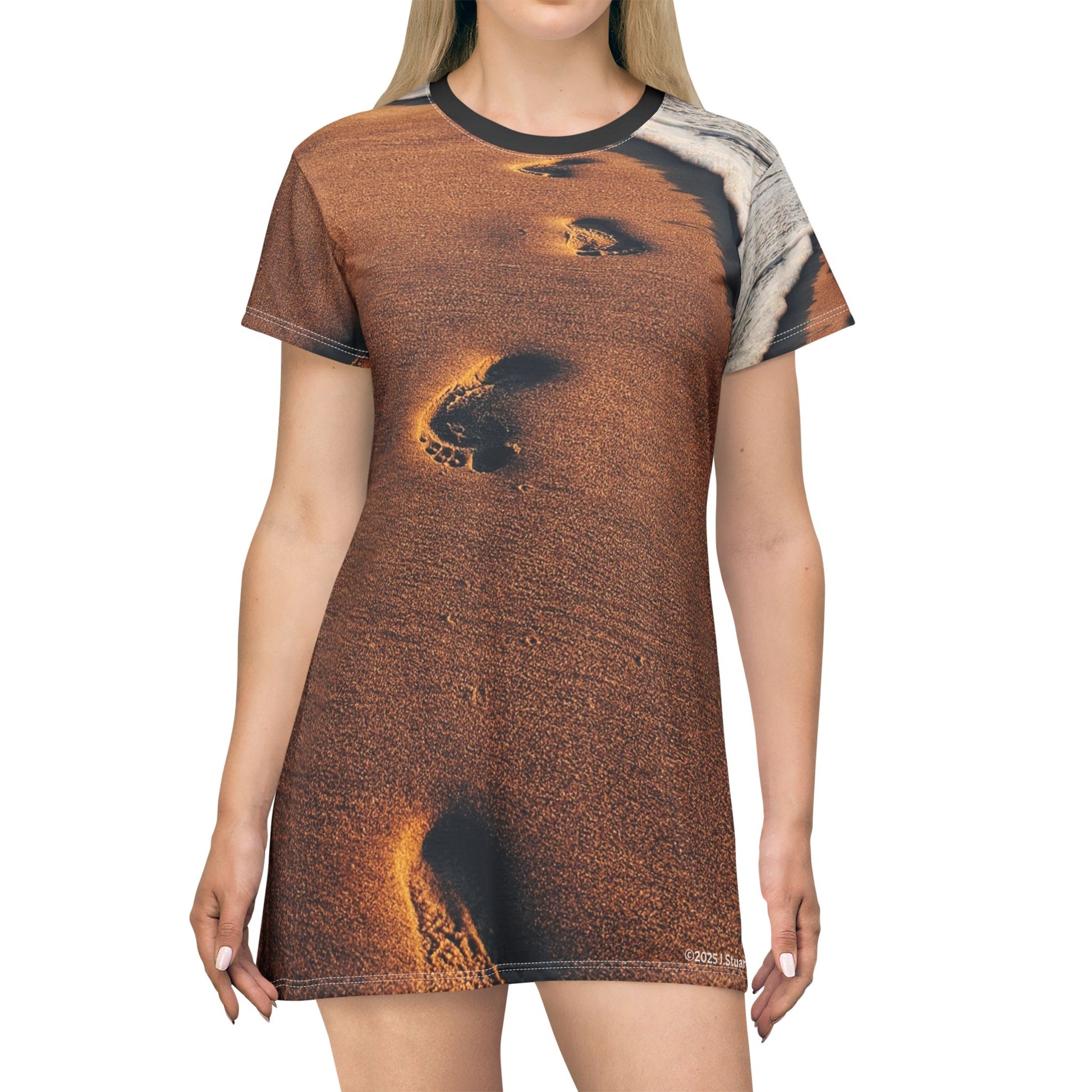 Swamis Vibe Coastal T-Shirt Beach Dress #6. Shoreline Reflections Artistic Nature Dress Beach-Themed T-Shirt Dress, Relaxed Fit Casual Dress, Summer Wardrobe Essential, Vacation Outfit, Footprints in Sand Design