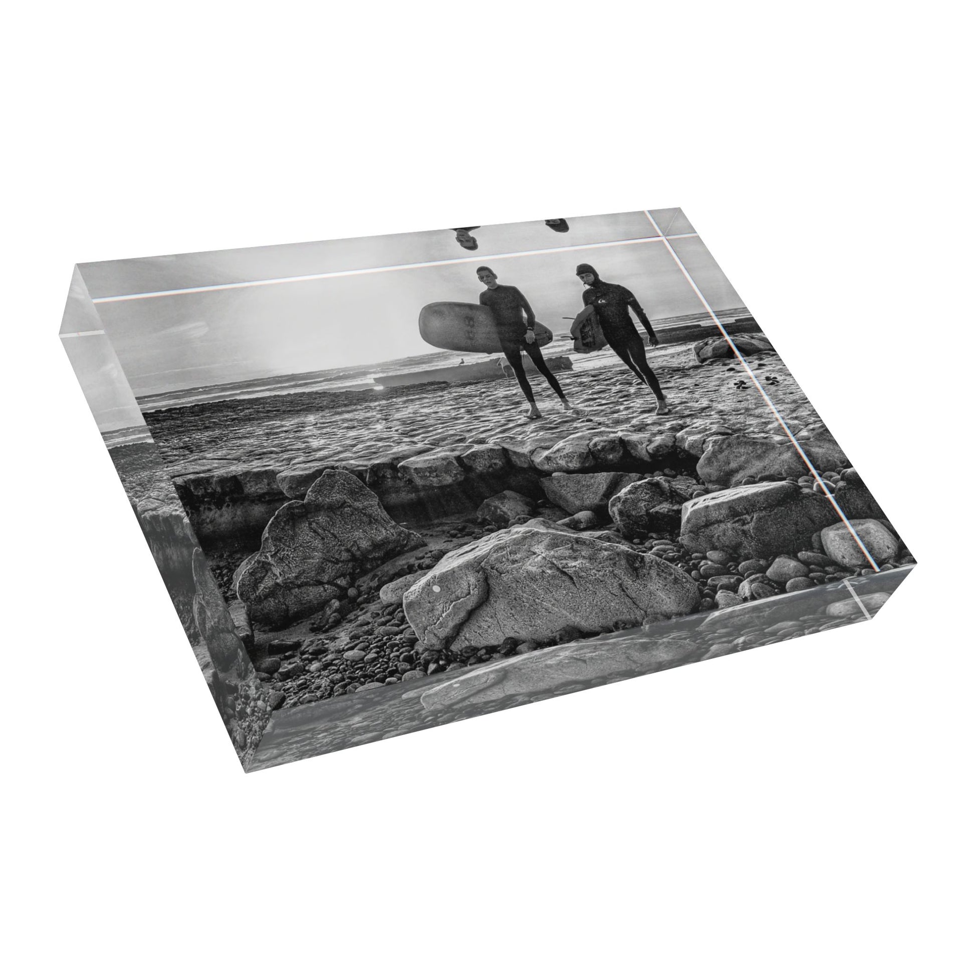 Swamis Vibe Surf and Sunsets Gallery Presents 2 Surfers on Ancient Swamis Reef 3D Surf Photo Block Home Decor, Gift for Surfers, Black and White Photography Display, Coastal Wall Art